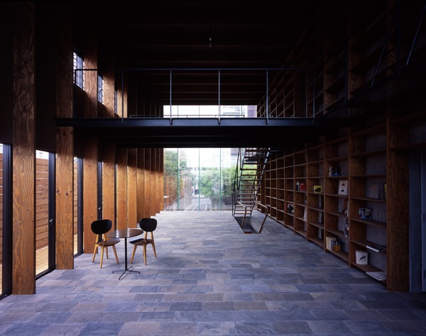 ❾大きな家。L字形のRCボリュームと、ロの字形に巡らされた木造フレームによって囲まれた大空間から構成される住宅。木造部では、反復配置された部材が高さ5.9mに及ぶ空間を覆う。鉄筋コンクリート部は木目が転写され、素材感のある空間が形成。(写真/Ken’ichi Suzuki)