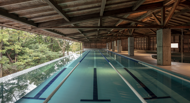水の家(プール)。静岡・伊豆高原に2025年7月オープンしたプール(25m・水深8m)やサウナ・温泉を備え、泳ぎ~ダイビング練習まで楽しめるアクティビティ施設。